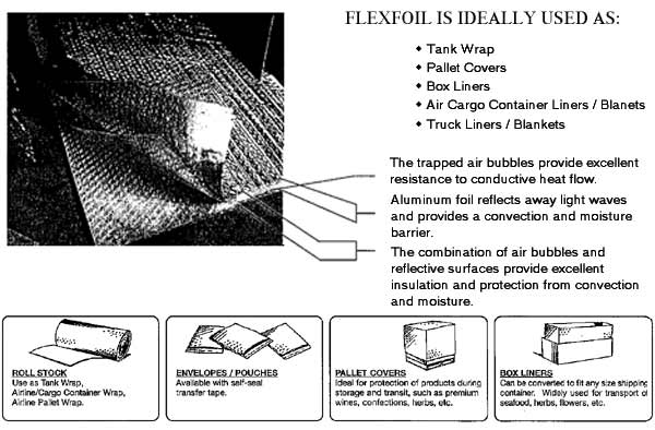 FlexFoil insulation uses a combination of the insulative qualities of trapped air bubbles and reflective aluminum foil surfaces to produce a highly effective thermal liner. FlexFoil is a revolutionary means for isulating temperature-sensitive products, suchs as herbs, flowers, seafood, mail-order perishables, pharmaceutical and biomedical products, etc...